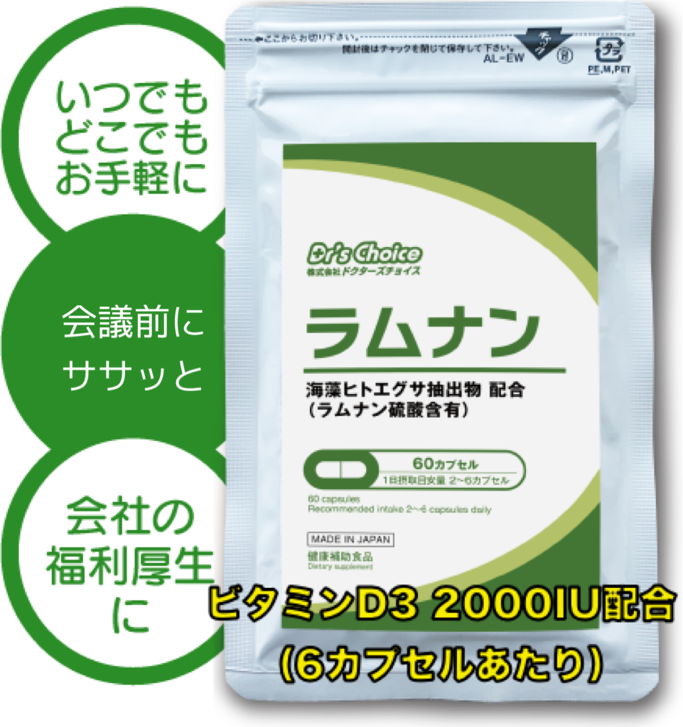 ラムナン(商品名)は、海藻の「あおさ(ヒトエグサ)」からラムナン硫酸を抽出して、手軽にラムラン硫酸の健康パワーを取り入れることができるサプリメントです。