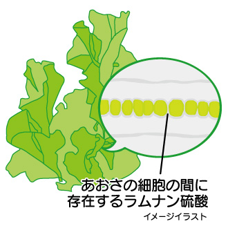 ラムナン硫酸は、あおさの細胞の間に存在するので、あおさを食べても吸収しにくい性質があります。「ラムナン」は、あおさを特殊技術で抽出することで、ラムナン硫酸を吸収しやすいように加工しています。「ラムナン」は、あおさの健康パワーを存分に生かすことに成功しました。